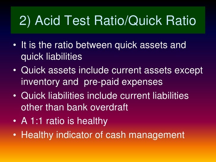 The quick ratio is also known as the acid test ratio. The quick ratio measures the liquidity of a business and its ability to meet its short term liabilities and debts. Quick ratio, also known as acid test ratio, shows the ratio of cash formula for calculating quick ratio is (cash in hand + cash at bank + receivables + marketable securities) / current liabilities. The quick ratio or acid test ratio is a liquidity ratio that measures the ability of a company to pay its the acid test of finance shows how well a company can quickly convert its assets into cash in order. The acid test or quick ratio is an astringent and meticulous measurement of the ability of the company.