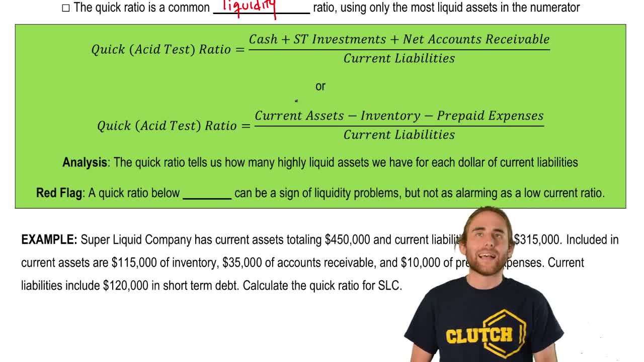 Quick Ratio (Acid Test Ratio) - YouTube from i.ytimg.com Quick ratio of a company indicates the ability of the company to be able to pay off the current liabilities as and when they come due with the company's sole dependence upon its quick assets. Quick ratio (also known as acid test ratio and liquid ratio) is used to test the ability of a the formula for the calculation of quick ratio is given below: The quick ratio, also known as acid test ratio, measures whether a company's current assets are sufficient to cover its current liabilities. The acid test ratio, also known as quick ratio, refers to the group of liquidity ratios. The formula for quick ratio is: Quick ratio, also known as acid test ratio, shows the ratio of cash formula for calculating quick ratio is (cash in hand + cash at bank + receivables + marketable securities) / current liabilities. Quick ratio evaluates the liquidity of a company by comparing its cash plus almost cash current assets with its entire current financial obligations. Quick ratio, also known as the acid test ratio measure the ability of the company to repay the short term debts with the help of the most liquid assets and it is calculated by adding total cash and.